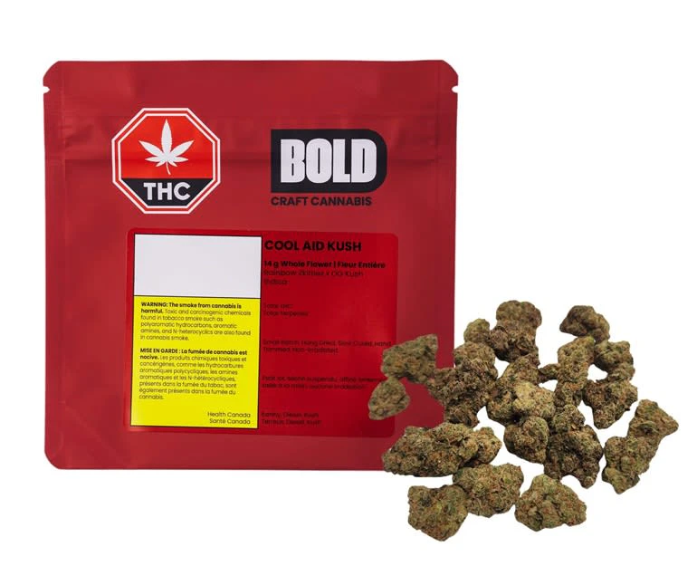 Cool Aid Kush is a heavy-hitting indica dominant strain that brings together the classic kush character of OG Kush and a citrus twist from Rainbow Zkittlez. Expect earth and diesel-forward aromas balanced by subtle notes of lemon, for a blissful experience. The buds are large and frosty, showcasing dark green hues and deep orange pistils. BOLD Craft Cannabis is indoor grown, small batch, hang dried, slow cured and hand trimmed.