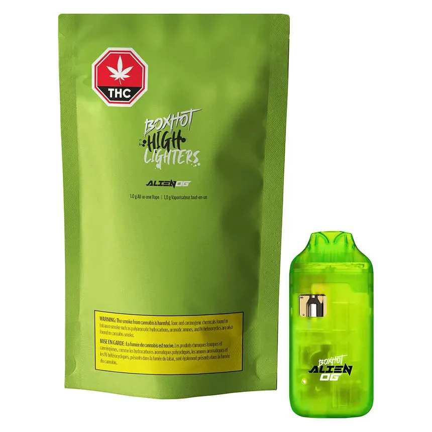 BOXHOT PRESENTS: Alien OG, a 1.0 g hybrid all-in-one vape featuring a colossal dose of THC and some of the purest cannabis distillate available on the market. This extraterrestrial monster blasts you with gas, earthy, and lime flavours on the inhale and leaves you with fruity pine on the exhale. All Highlighters are equipped with rechargeable USB-C technology, which means you won't run out of juice before you run out of juice.