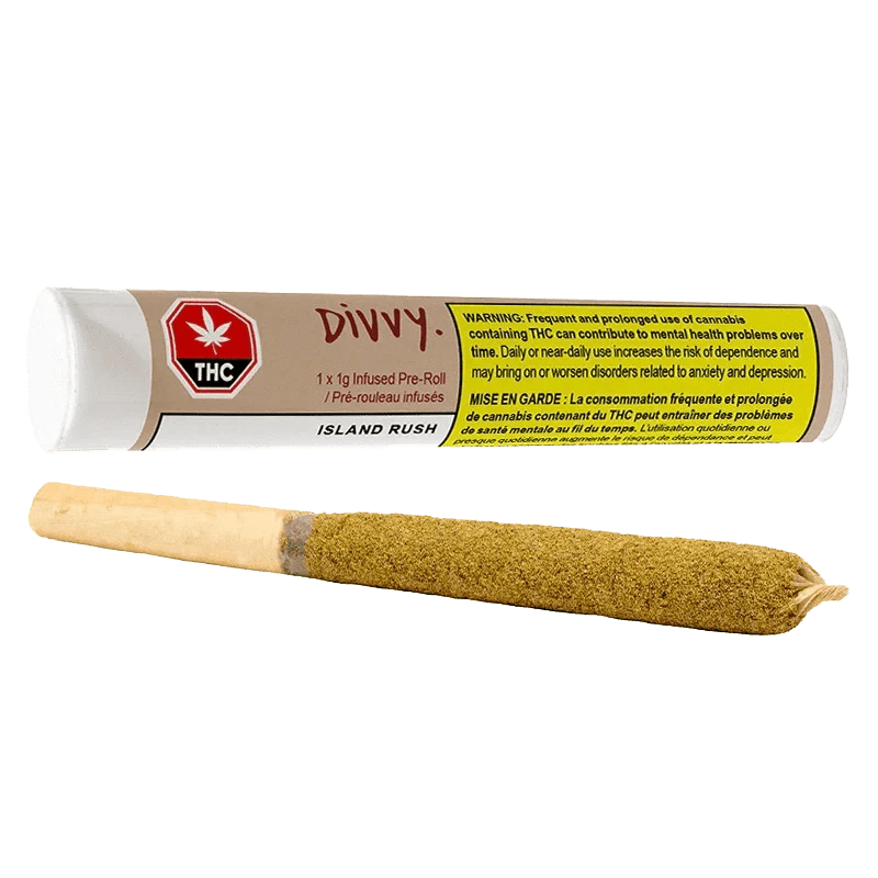 Island Rush is a blend of tangy strawberries and luscious tropical mangoes, delivering puffs of summer in every draw. We've amped up our Divvy flower with an infusion of terpenes, distillate and kief for a blast of THC and flavour all in one.