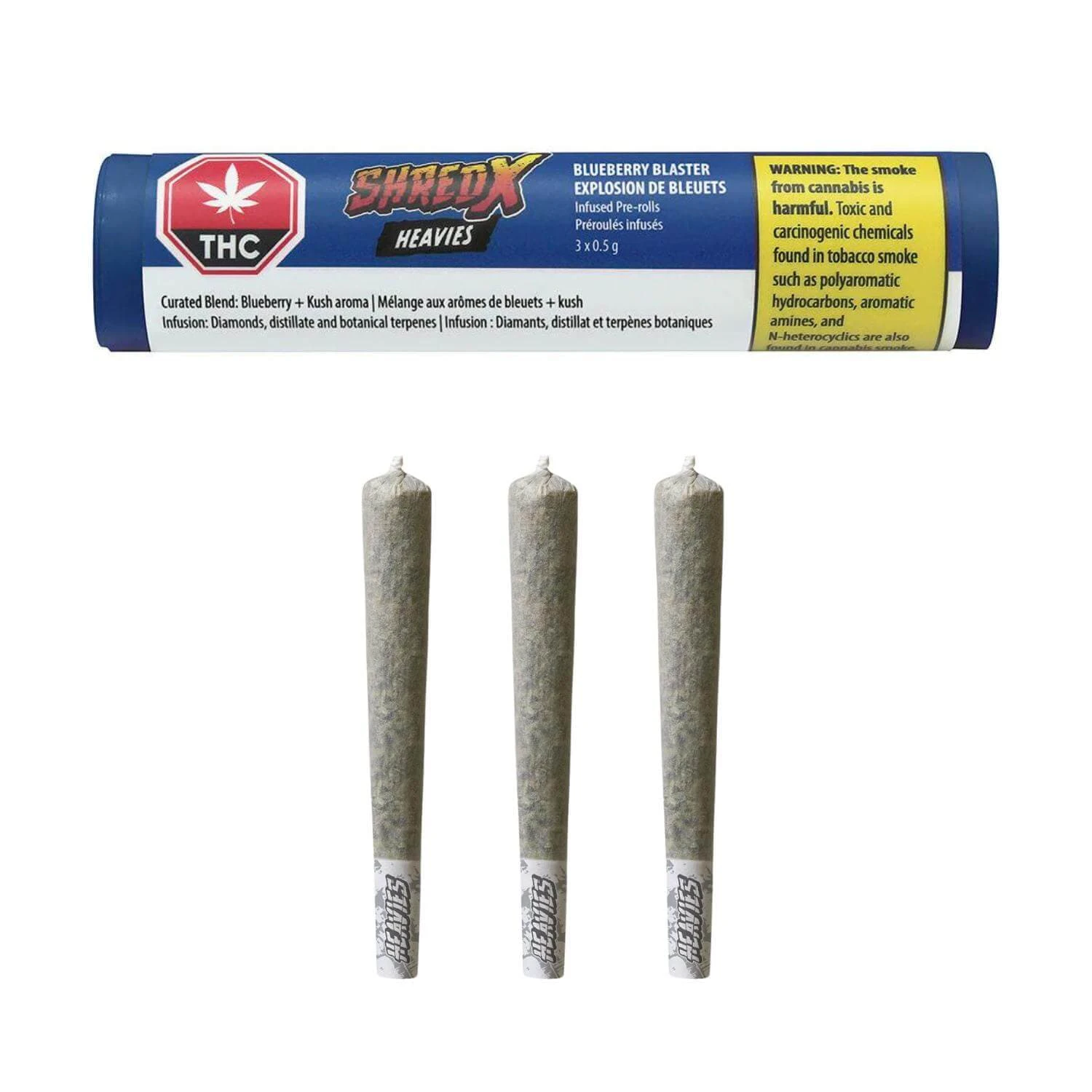 Get ready to get blasted, blueberry style, with our new SHRED-X Heavies. These Blueberry Blaster infused pre-rolls deliver an aromatic and smooth blueberry and kush burn experience, and with the added distillate and pure THCa crystals, they are definitely NOT for lightweights. Boasting an ultra-heavy +40% THC, in a single doob tube, this trio of 0.5g infused pre-rolls are ideal for sharing or getting heavy all by yourself.