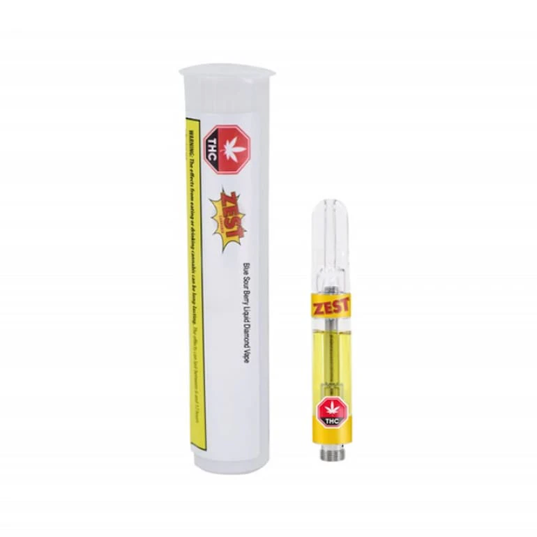 Zest Cannabis 1G Blue Sour Berry Liquid Diamond BHO vape cart. High THC, a tangy, floral vibe. Flavour first experience using 510 CCELL tech.